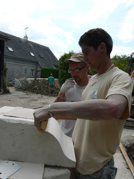 Nous travaillons les pierres sur le chantier en règle générale, ce qui permet à nos clients de voir notre progression et la transformation d’un bloc en élément de décor.